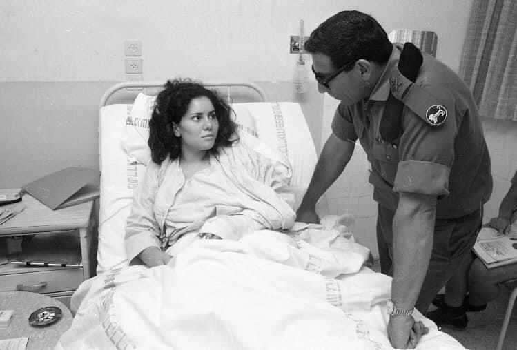 المناضلة تيريزا هلسة في المستشفى يحقق معها مجرم الحرب رحبعام زئيفي بعد اختطافها لطائره في مطار اللد عام ١٩٧٢ كان الهدف منها إطلاق سراح المناضلين في سجون الاحتلال الفاشي.